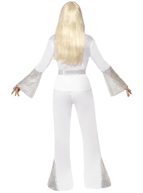 כולל חולצה לבנה, מכנסיים מתרחבים ואת חגורת כסף לבנים.