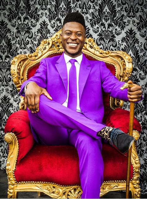 תחפושת אלגנטי זה כולל עניבה, ז'קט ומכנסיים בצבע סגול.