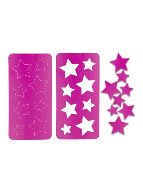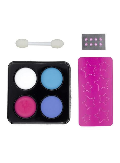 Includes a palette of four colors (white, blue, purple, and pink), a double applicator, eight adhesive gems, and three templates in star shapes to create magical effects. The shades apply easily, blend well, and come off effortlessly, allowing for results as sweet as the stories that inspire them. Its presentation in a decorated blister makes the makeup visually irresistible.