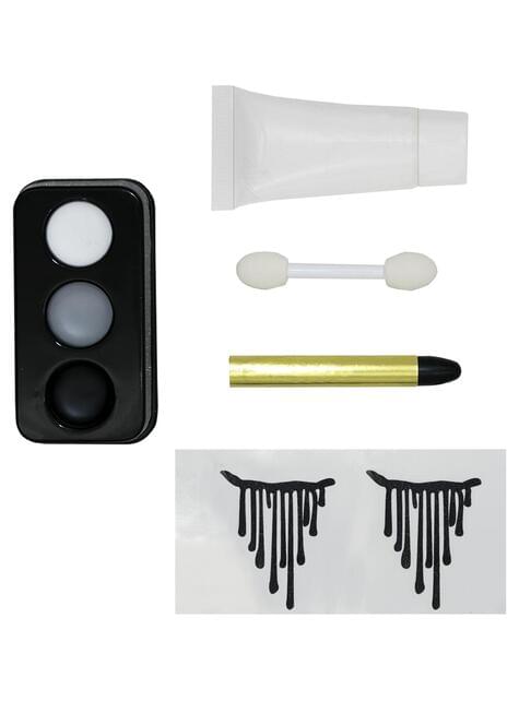 Includes a palette of three colors (white, gray, and black), a double applicator, a black pencil, white base, and adhesive tattoos with black tears to intensify the effect. The texture is creamy and easy to apply, allowing for shadows and contrasts to be created with great precision. Moreover, its packaging in a blister with a dark background reinforces that mysterious and eerie air characteristic of the character.